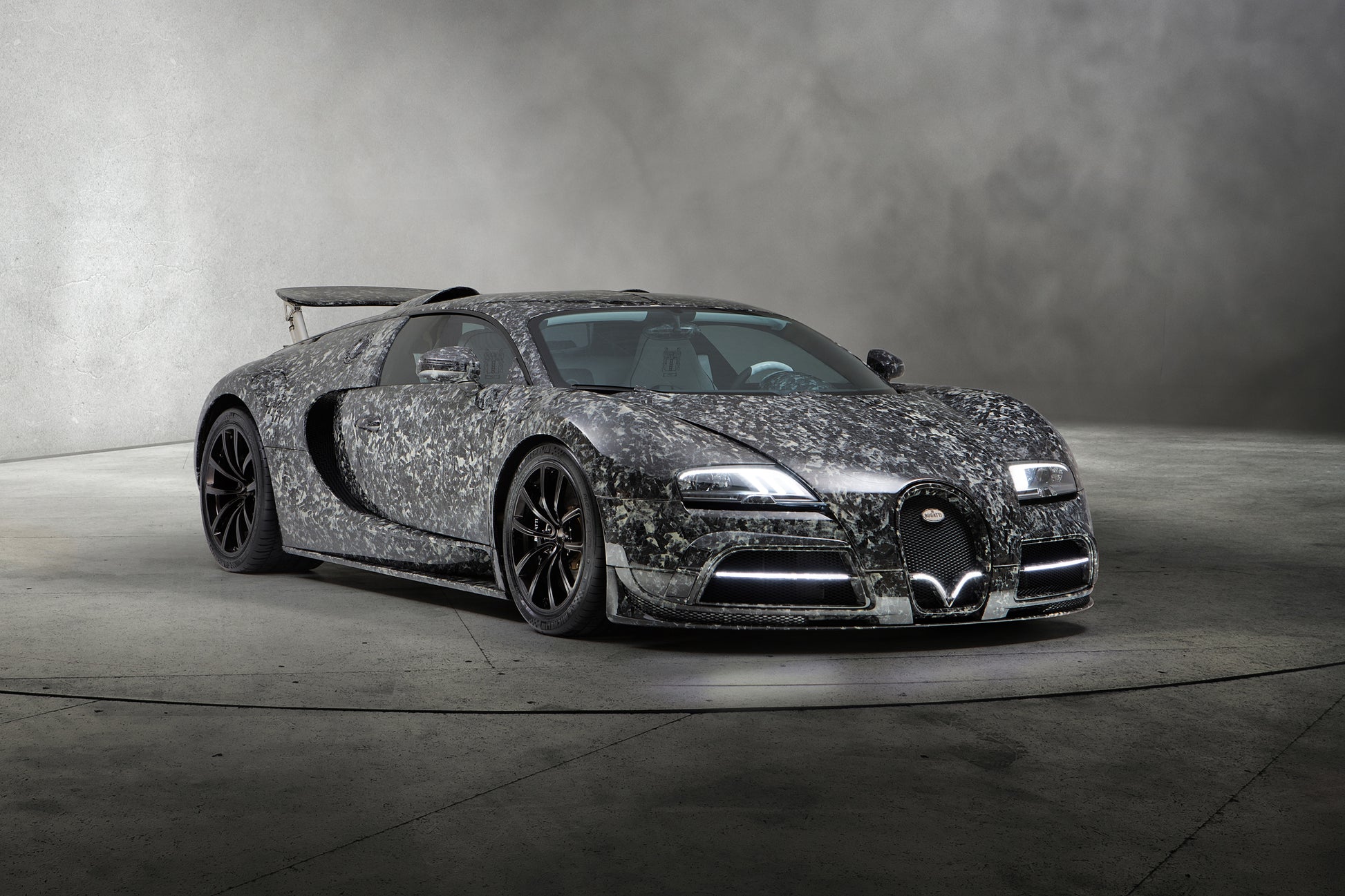 This Mansory Bugatti Veyron Vivere Diamond Edition artwork captures the hypercar’s extreme exclusivity and handcrafted luxury in a dramatic studio setting. Finished in a distinctive diamond-inspired textured carbon exterior, the composition highlights the Veyron’s wide stance, signature horseshoe grille, and precision-engineered bodywork. Subtle lighting and muted surroundings elevate the sculptural form, making this piece a bold statement of performance, rarity, and elite automotive design.