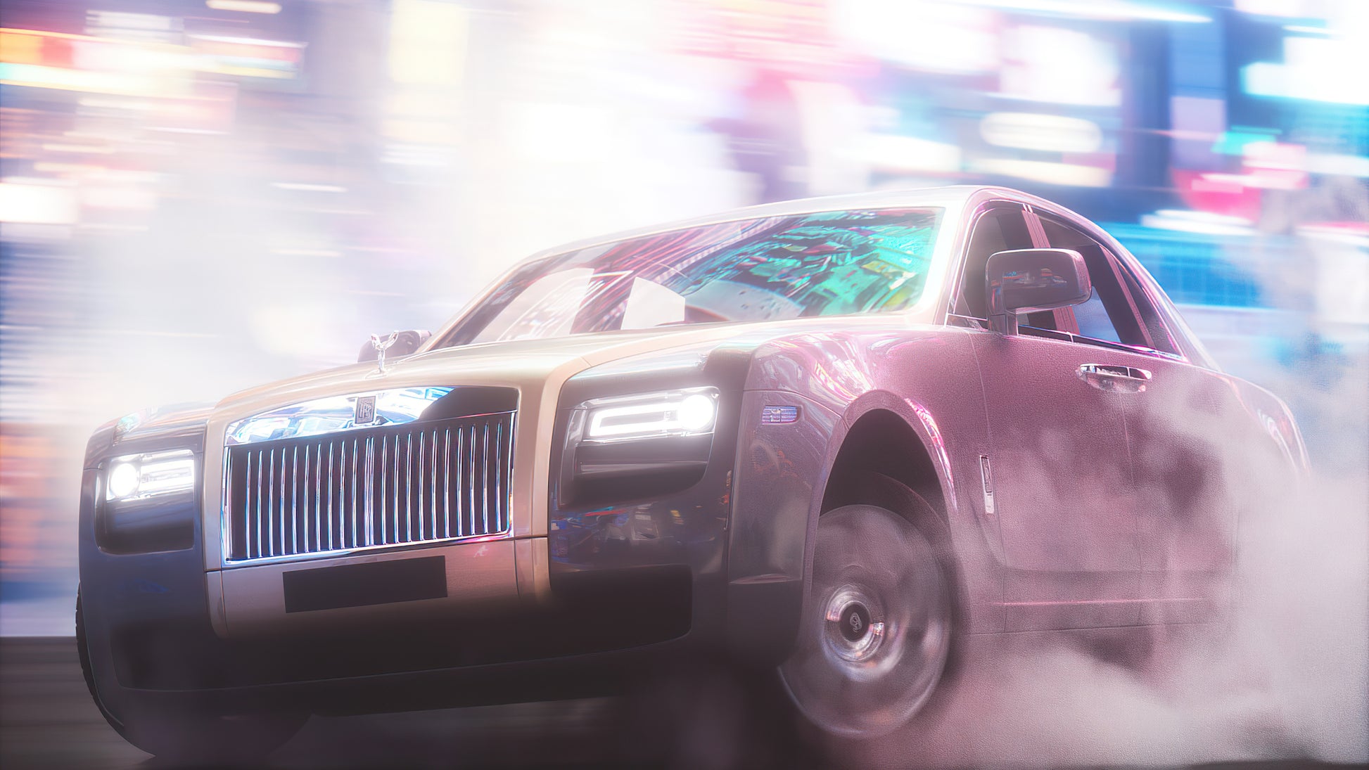 This high-impact automotive image captures a Rolls-Royce Phantom in a rare, adrenaline-charged moment, sliding through a neon-lit cityscape as tire smoke billows around its sculpted form. Motion blur and glowing reflections transform the traditionally stately luxury sedan into a symbol of unexpected power, rebellion, and modern excess.